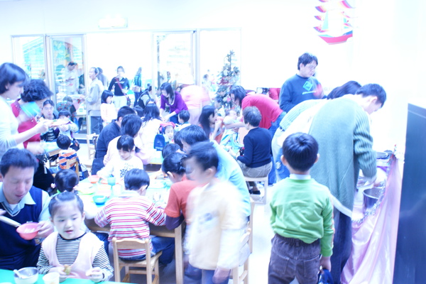 好不容易完成20人份的三明治, 就趕快載著小猴仔去學校. 原本Party應該一點才開始, 沒想到等我們十二點多到的時候, 竟然大家都已經開動了, 連個座位都沒有, 真是人山人海阿, 有點出乎我的意料之外. 小花我一個人不但要忙著幫小猴仔拿東西吃, 又還要忙著拍照, 真忙碌阿~~~