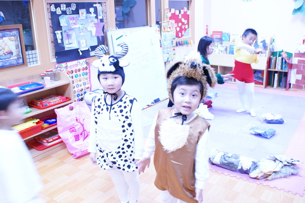好不容易到了今天的重頭戲--戲劇表演的時間了, 小猴仔今天要演出的角色是牛. 看到他換上戲服後忍不住笑出來, 因為他的臉本來就圓了, 現在更是圓上加圓, 可以當肉餅了