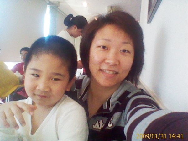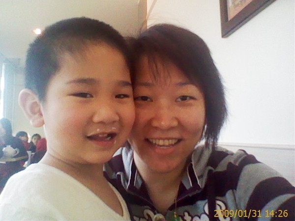 剛開始蛋糕送上來時, 小猴仔吃的津津有味的模樣讓我忍不住想拿起手機拍下來, 拍著拍著, 我們兩個開始在店裡玩起自拍來了.越拍越high, 也不顧別人的異樣眼光.小猴仔咯咯笑的很開心, 後來我們兩個索性做起鬼臉來,不過因為做鬼臉的照片實在太醜了, 為避免嚇到大家, 就@#$%. 想不到這下午茶自拍竟讓我們找到了意外的樂趣.