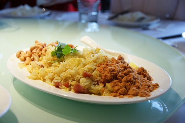 鳳梨海鮮炒飯則是點來給小猴仔吃的. 少許的咖哩粉搭配著泰國米的海鮮炒飯,旁邊還灑著肉鬆跟腰果,吃起來有著淡淡的咖哩香,而且因為是泰國米,所以炒起來感覺粒粒分明. 小猴仔一口氣就吃了三碗呢