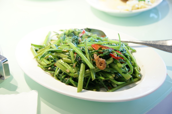店家上菜的速度還蠻快的.在第一道菜上桌時,服務生會詢問客人的白飯是要泰國米還是台灣米, 而白飯的部份則是無限提供的. 第一道上桌的是蝦醬空心菜,少量的蝦醬搭配著空心菜熱炒,散發著誘人的香氣.配著白飯吃很不錯喔.