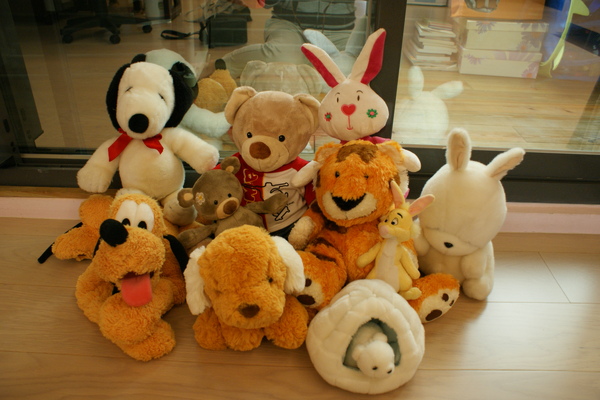 一回到家後,就趕緊把自己新買的娃娃和幾個最喜歡的通通排排坐好,讓他們互相認識一下. 其實這些娃娃中,有一部分是小花自己買的,有些則是知道小花喜歡絨毛娃娃的朋友送的, 所以一直都很寶貝. 其中還有一個胖胖兔抱枕是小花很喜歡的, 但是因為之前送給了朋友,所以這邊看不到.