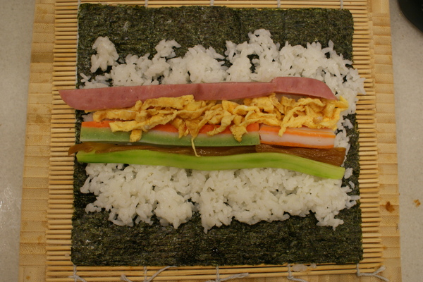 就這樣開始認真的包起壽司來. 也許是因為很久沒包了,心情竟然有點緊張,結果好像還好,還可以見人,呵呵......結果兩個多小時下來我竟然一口氣包了十幾條的壽司,後來連盒子都裝不下. 這時的我不禁開始擔心了起來, 如果明天大家都不要吃壽司而要吃烤肉, 我一個人要怎麼解決這一大盒的壽司阿