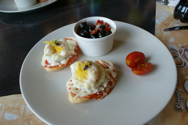 接著送來的是海鮮塔, 烤得酥脆的麵包上放著西班牙臘腸、水煮蛋和蝦子並淋上sauce, 口感非常的清爽. 至於旁邊的醃漬橄欖則無法獲得我的青睞.