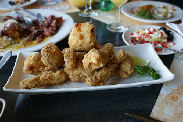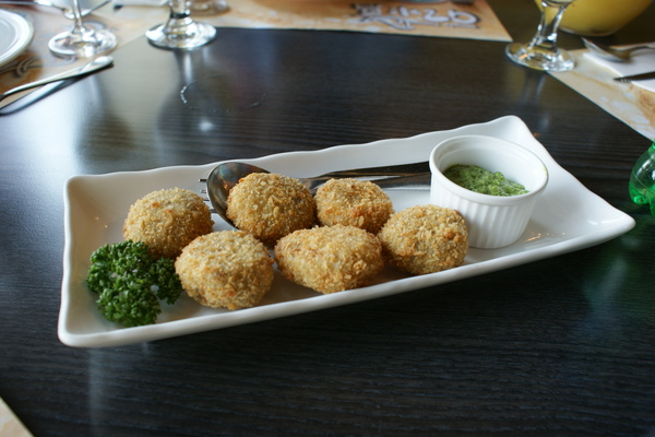 首先服務生送來的前菜是鮮炸鹹魚丸佐香草綠沙司, 魚丸的口感很Q, 個人覺得原味比沾醬好吃. 基本上旁邊著綠色沾醬口味蠻清新, 可是跟炸魚丸搭配起來吃沒有太大的加分效果, 倒不如原味比較可以吃的出魚肉的鮮甜.